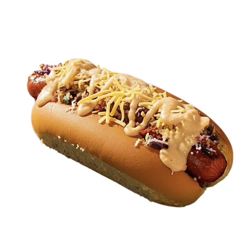 $9.99A 4 oz beef hotdog on a soft split-top potato bun topped with crunchy fried onions, plant-based chili, signature sauce, and creamy cheese shreds.