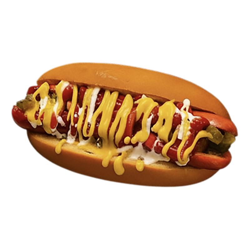 $7.99A 4 oz beef hotdog on a soft split-top potato bun with a classic spread of relish, mayo, mustard, and ketchup.